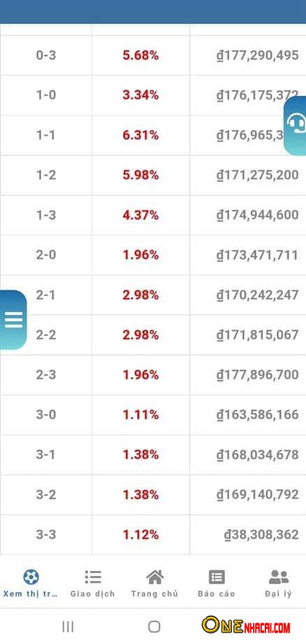 Số tiền đặt cược cho tỷ số bảo toàn vốn (3-3) xấp xỉ 552 tỷ với phần trăm lợi nhuận là 1.12%, nếu win thì sàn sẽ trả 552*1.12%*0.95 ~ 5 tỷ 900 triệu (đã trừ phí)